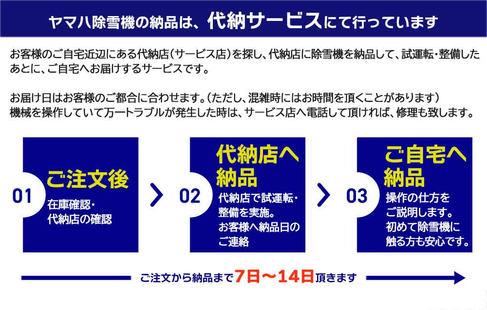 ご注文後、メーカーよりサービス店(代納店)に配送、整備して、お客様宅にお届けします。