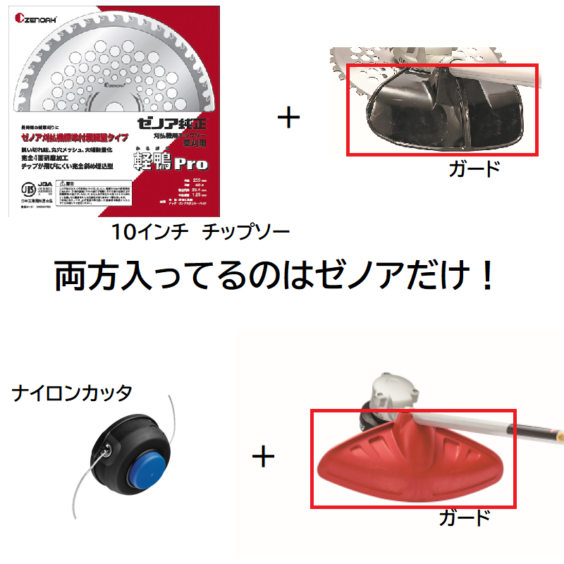 片掛けハーネス付。10”チップソーと、ナイロンコードの両方が付属してどちらでも使えます。