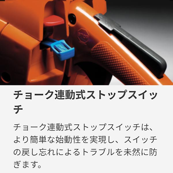 また、Smart Start(R) 技術により、最小限の労力で簡単に始動できます。キックバックが発生した場合は、効果的なイナーシャ式チェンブレーキがチェンを直ちに停止させ、負傷の可能性を低減します。