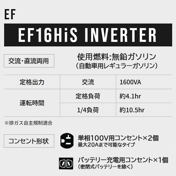 アースパワー インバーター発電機 EF16HiS 【定格出力1.6kVA(1600W)】【並列 運転3.0kVA(3000W)】Earth POWER