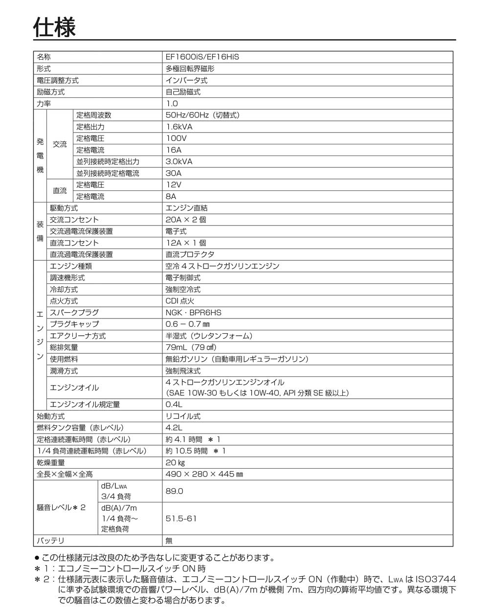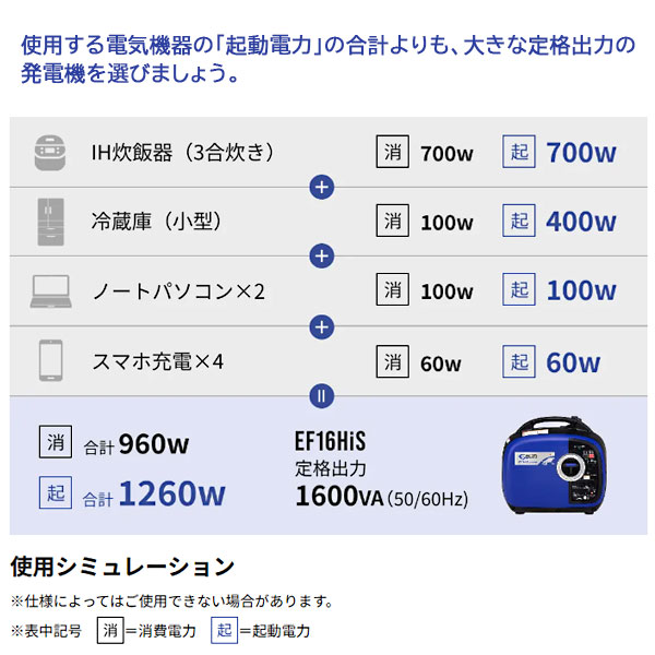 アースパワーのインバーター発電機 EF16HiSは定格出力1.6kVA(1600W)です。