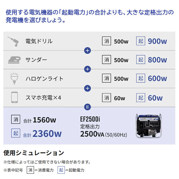 使用する電気機器の起動電力を足し算することでどれぐらいの発電量をもつモデルが適しているかが分かります。