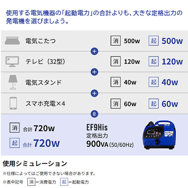 アースパワーのインバーター発電機 EF9HiSは定格出力0.9kVA(900W)です。