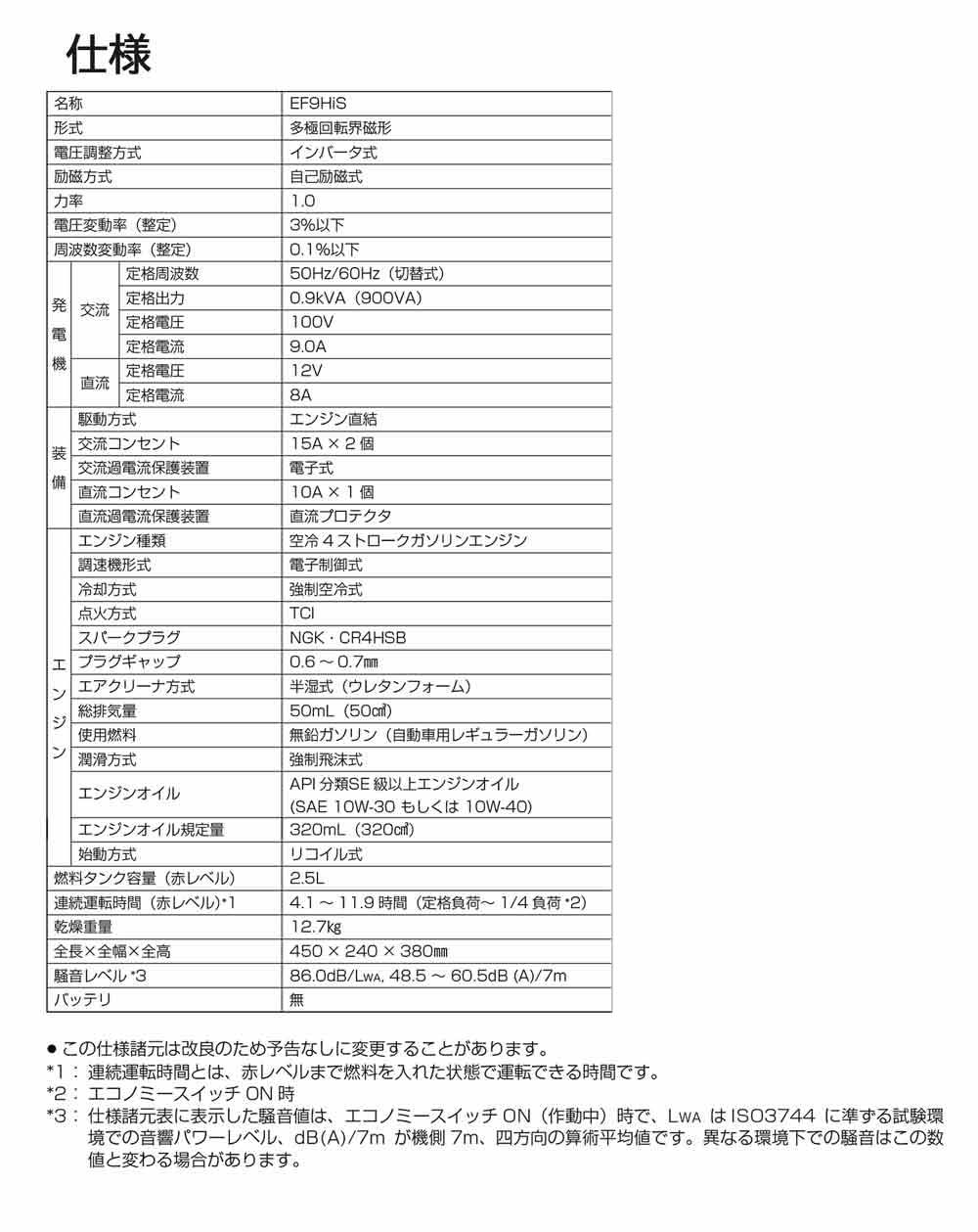 本製品はヤマハ発動機のEF9HiS、 EF900iSと同スペックです。