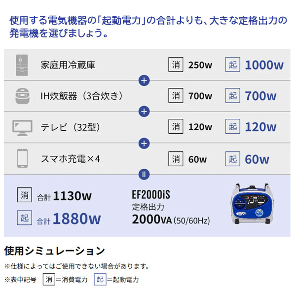 アースパワーのインバーター発電機 EF2000iSは定格出力2.0kVA(2000W)です。